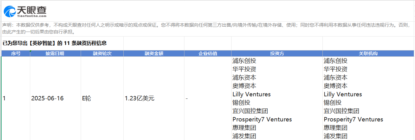 英矽智能今年6月16日披露了E轮融资,融资规模为1.23亿美元,投资方包括浦东创投、华平投资、浦东资本、奥博资本、Lilly Ventures、锡创投、宜兴国控集团、Prosperity7 Ventures、惠理集团、浦发集团等机构。