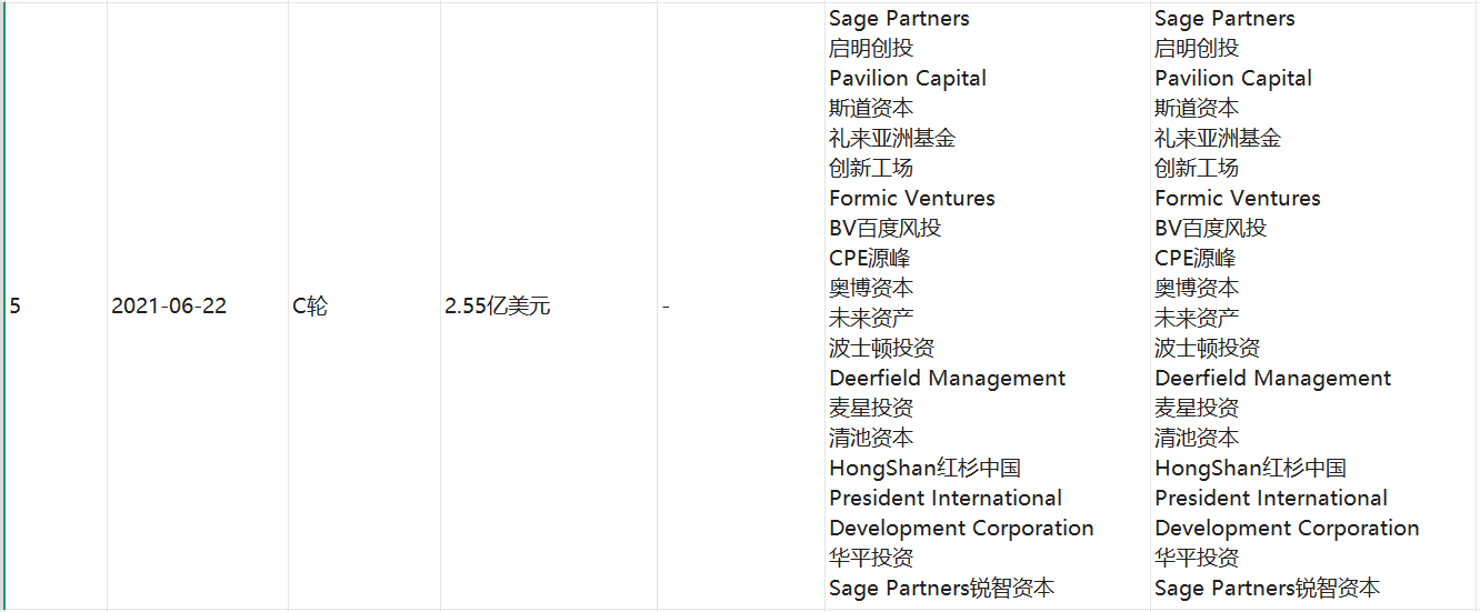 英矽智能2021年6月进行了C轮融资,投资方包括Sage Partners、启明创投、Pavilion Capital、斯道资本、礼来亚洲基金、创新工场、Formic Ventures、BV百度风投、CPE源峰、奥博资本、未来资产、波士顿投资、Deerfield Management、麦星投资、清池资本、HongShan红杉中国、President International Development Corporation、华平投资、Sage Partners锐智资本、Bold Capital Partners等机构,融资规模为2.55亿美元。