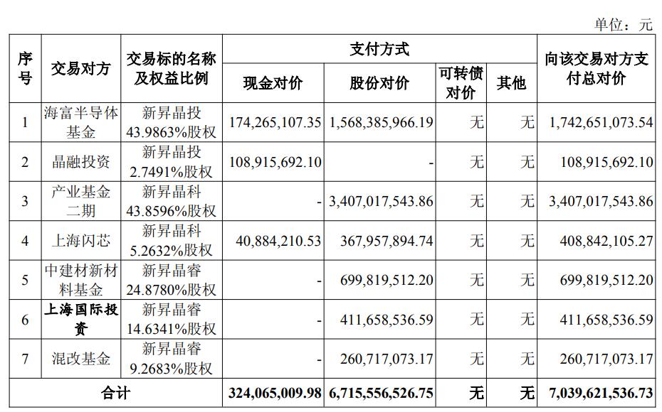 沪硅产业拟向海富半导体基金发行股份及支付现金购买其持有的新昇晶投43.9863%股权,拟向晶融投资支付现金购买其持有的新昇晶投2.7491%股权,拟向产业基金二期发行股份购买其持有的新昇晶科43.8596%股权,拟向上海闪芯发行股份及支付现金购买其持有的新昇晶科5.2632%股权,拟向中建材新材料基金发行股份购买其持有的新昇晶睿24.8780%股权,拟向上海国际投资发行股份购买其持有的新昇晶睿14.6341%股权,拟向混改基金发行股份购买其持有的新昇晶睿9.2683%股权。