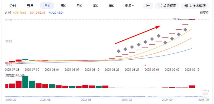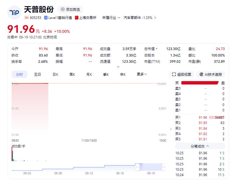 9月18日,二度停牌核查的天普股份(605255.SH)复牌后再度封死涨停板,收盘价飙升至83.6元/股。这是该股自8月22日以来的连续第12个涨停板,累计涨幅超过213%。