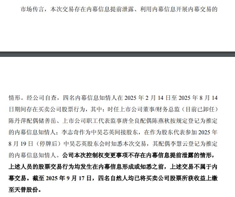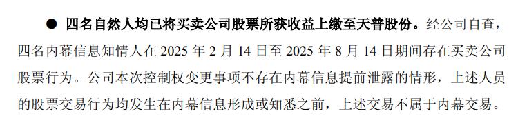 不过,天普股份强调,上述人员的股票交易行为均发生在内幕信息形成或知悉之前,上述交易不属于内幕交易。截至2025年9月17日,四名自然人均已将买卖公司股票所获收益上缴至天普股份。公司本次控制权变更事项不存在内幕信息提前泄露的情形。