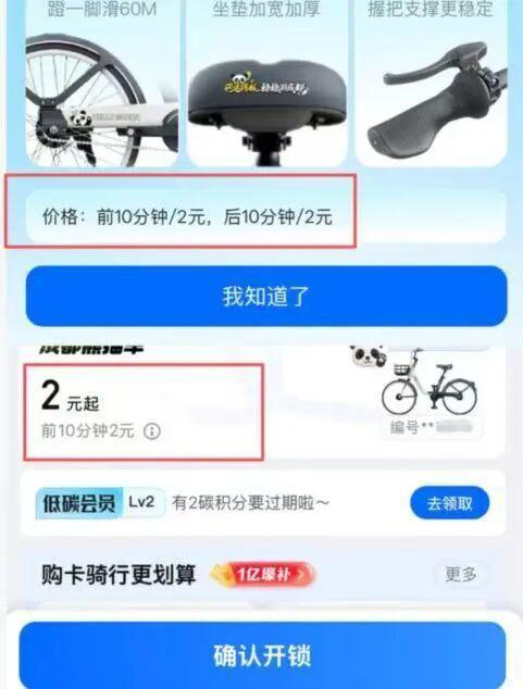 熊猫车确认开锁后(上图)才可看到“后10分钟/2元”提示,开锁前(下图)仅有“前10分钟2元”的提示。
