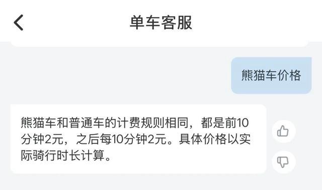 为此,记者随后联系了哈啰客服,其在回复中表示:“熊猫车和普通车的计费规则相同,后续都是每10分钟2元。”显然,这一回答与实际的计费规则相互矛盾。