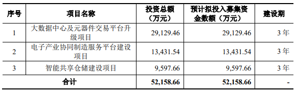 云汉芯城2025年9月25日披露的首次公开发行股票并在创业板上市招股说明书显示,公司原拟募资52,158.66万元,用于大数据中心及元器件交易平台升级项目、电子产业协同制造服务平台建设项目和智能共享仓储建设项目。