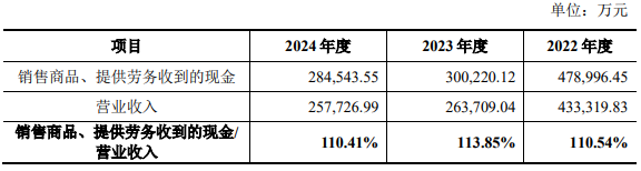 2023年、2024年,云汉芯城销售商品、提供劳务收到的现金及经营活动产生的现金流量净额均下降。2022年至2024年,公司销售商品、提供劳务收到的现金分别为478,996.45万元、300,220.12万元、284,543.55万元,经营活动产生的现金流量净额分别为18,817.20万元、7,517.24万元、2,044.39万元,净现比分别为1.34、0.96、0.23。