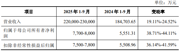 2025年1至9月,公司预计实现营业收入220,000至230,000万元,较上年同期增长19.11%至24.52%,预计实现归属于母公司所有者的净利润为7,700至8,000万元,较上年同期增长38.71%至44.11%;扣除非经常性损益后归属于母公司所有者的净利润为7,500至7,800万元,较上年同期增长36.14%至41.59%。
