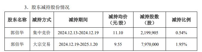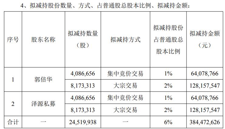 公告显示,郭倍华持有公司股份123,496,474股(占公司总股本的30.22%),持股5%以上股东泽源私募持有公司股份20,450,000股(占公司总股本的5.00%)。郭倍华、泽源私募计划自公告披露之日起15个交易日后的三个月内,即2025年11月3日起至2026年2月2日止,均分别以大宗交易方式减持公司股份不超过8,173,313股(不超过公司目前总股本的2%)和以集中竞价交易方式减持公司股份不超过4,086,656股(不超过公司目前总股本的1%)。