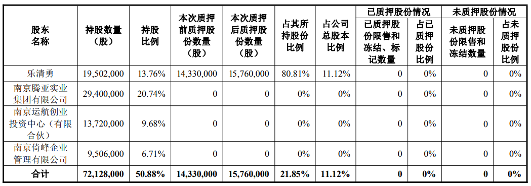 此前于9月15日,腾亚精工披露关于实际控制人部分股份质押的公告显示,公司实际控制人乐清勇已质押公司15,760,000股,占公司总股本的11.12%。