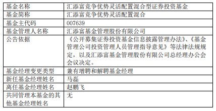 汇添富竞争优势灵活配置混合增聘马磊 赵鹏飞离职