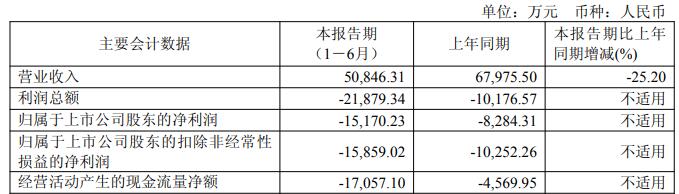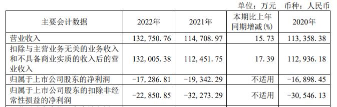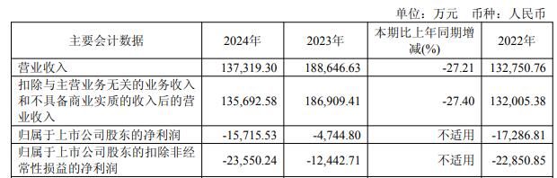 2020年至2024年,公司实现归属于上市公司股东的净利润分别为-16,898.45万元、-19,342.29万元、-17,286.81万元、-4,744.80万元、-15,715.53万元;归属于上市公司股东的扣除非经常性损益的净利润分别为-30,546.13万元、-32,273.29万元、-22,850.85万元、-12,442.71万元、-23,550.24万元。