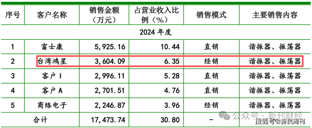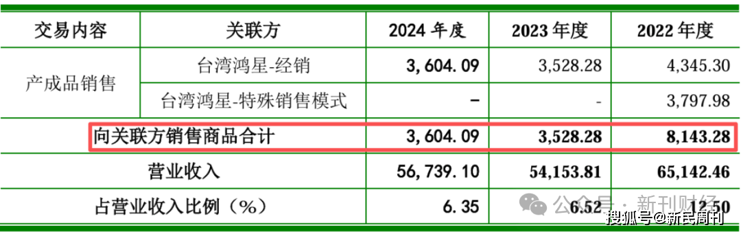 富士康作为其2024年第一大客户,销售金额为5,925.16万元,占比10.44%;第二大客户是台湾鸿星,销售金额为3,604.09万元,占比6.35%;公司2023年度对台湾鸿星销售金额为3,528.28万元,占比6.52%;2024年对台湾鸿星销售金额为8,143.28万元,占比12.5%。报告期对台湾鸿星合计销售金额为15,275.65万元,占报告期总销售收入(176,035.37万元)的比率为8.68%。台湾鸿星是公司的关联方,是台湾地区销售的经销商,报告期一直位居第二大客户的地位,记者也注意到,鸿星科技报告期第一大客户始终为富士康,也是一家台湾企业。