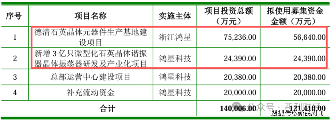 鸿星科技本次IPO拟募集资金总额12.14亿元,其中投向德清石英晶体元器件生产基地建设项目5.66亿元,公司配置1.86亿元,共计投资7.52亿元,募集资金占比75.28%;投向新增3亿只微型化石英晶体谐振器晶体振荡器研发及产业化项目2.44亿元,该项目总投资2.44亿元即资金全部来自募集资金。另外还要补充流动资金2亿元。