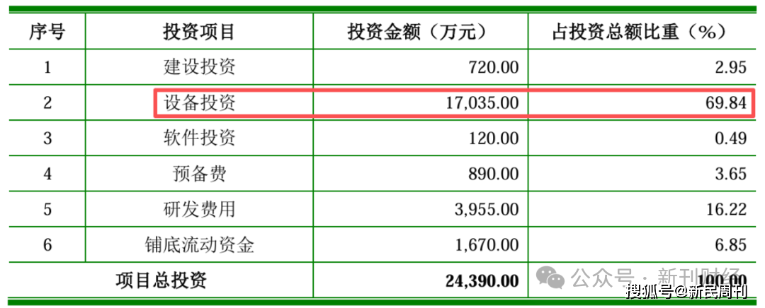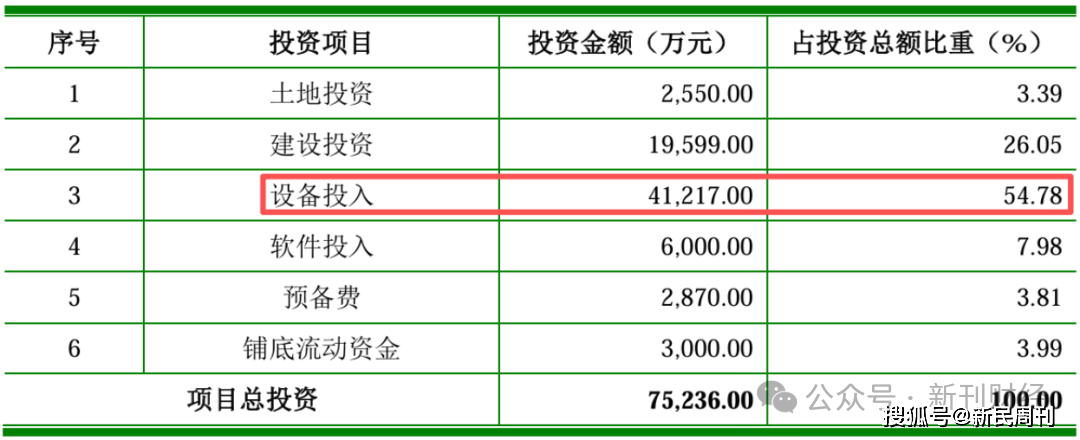 德清石英晶体元器件生产基地建设项目设备投入4.12亿元,占总投资比重的54.78%,折算为占用募集资金金额为1.70亿元,加上另外一个项目设备投资1.70亿元,二者合计为3.4亿元,占募集资金的28%。