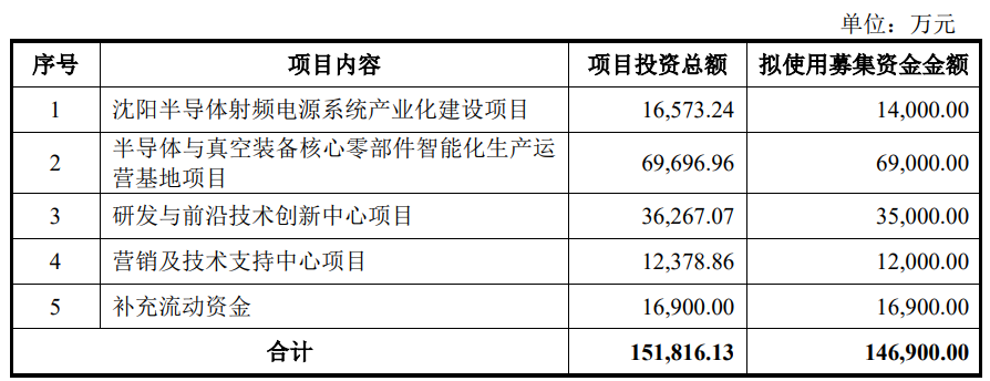 招股书显示,恒运昌拟在上交所科创板上市,募集资金146,900.00万元,用于沈阳半导体射频电源系统产业化建设项目、半导体与真空装备核心零部件智能化生产运营基地项目、研发与前沿技术创新中心项目、营销及技术支持中心项目、补充流动资金。