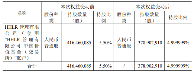 公司于2025年8月22日收到HHLR的告知函,2025年6月30日至2025年8月22日,HHLR通过集中竞价交易方式减持公司37,557,175股股份,本次减持计划已实施完毕。截至2025年8月22日,HHLR持有公司股份数量378,902,910股,持股比例4.999999%,不再为公司持股5%以上股东。