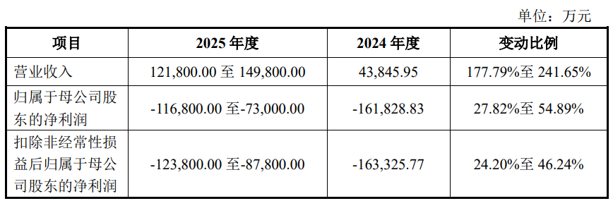 公司预计2025全年营业收入为121,800.00万元至149,800.00万元,同比增长177.79%至241.65%;预计归属于母公司股东的净利润-116,800.00万元至-73,000.00万元;预计扣除非经常性损益后归属于母公司股东净利润为-123,800.00万元至-87,800.00万元。
