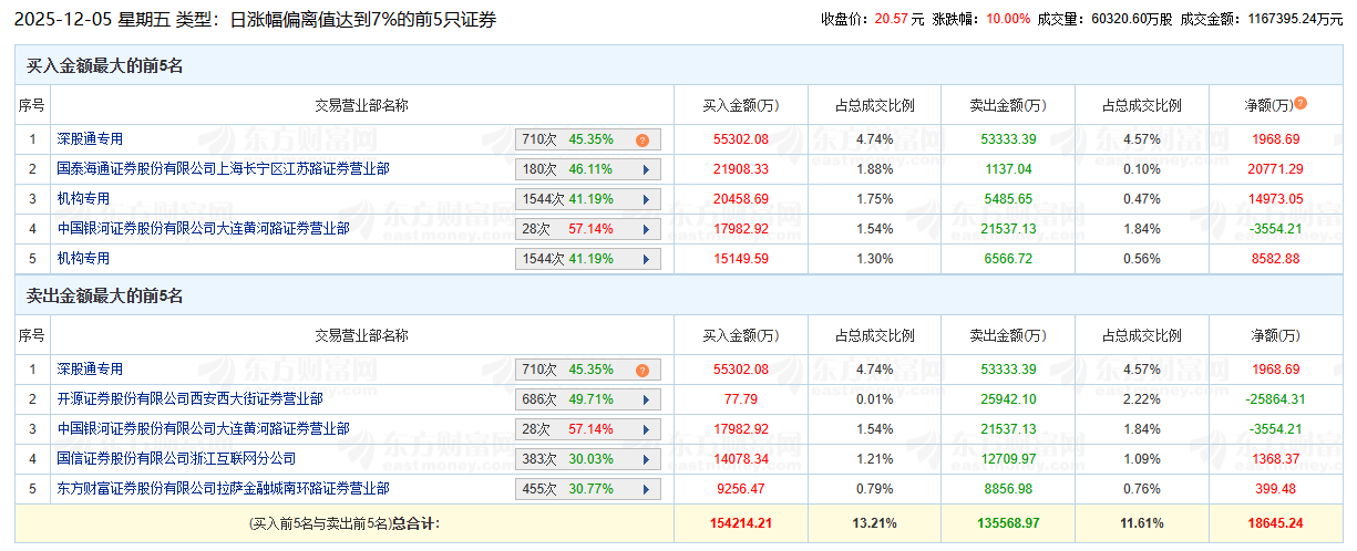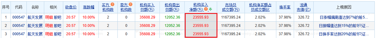 龙虎榜数据显示,作为日涨幅偏离值达到7%的前5只证券,航天发展买入金额最大的前五名中,有2家机构专用席位。经统计,航天发展的机构席位今日净买入金额为23555.93万元。