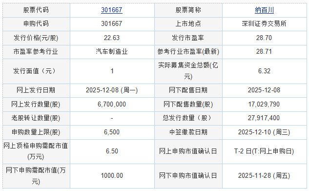 纳百川2025年12月5日披露的首次公开发行股票并在创业板上市发行公告 显示,按本次发行价格22.63元/股和2,791.74万股新股发行数量计算,公司募集资金总额预计为63,177.08万元,扣除发行费用约7,621.86万元(不含增值税)后,预计募集资金净额约为55,555.22万元(如存在尾数差异,系四舍五入造成)。
