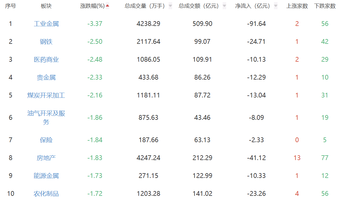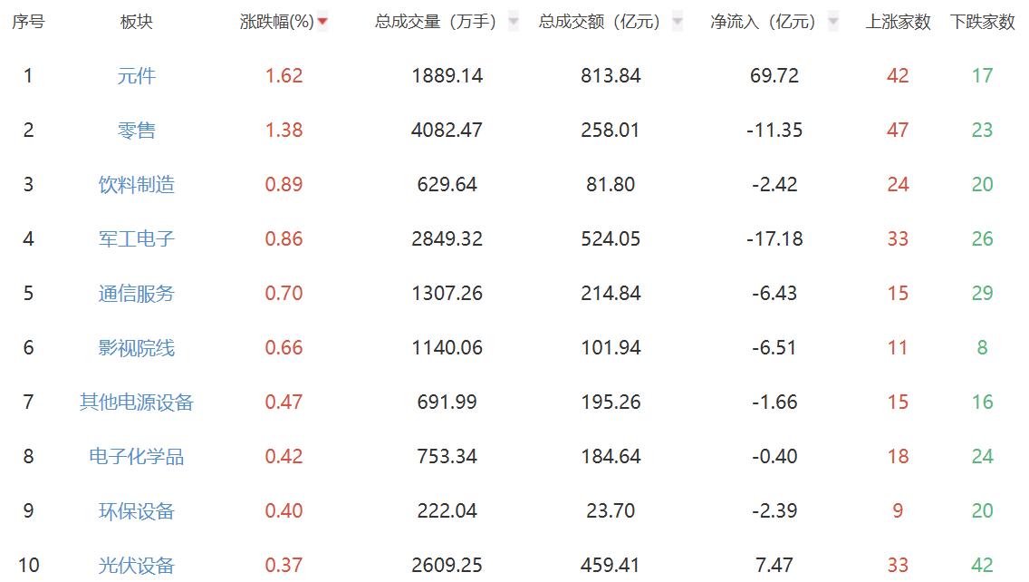 板块方面,元件、零售、饮料制造等板块涨幅居前,工业金属、钢铁、医药商业等跌幅居前。