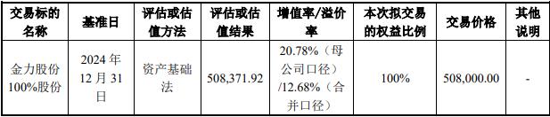 根据中联评估以2024年12月31日为评估基准日出具的《资产评估报告》,截至评估基准日,标的公司股东全部权益价值的评估值为508,371.92万元,较母公司口径账面价值420,892.47万元增值87,479.45万元,母公司口径账面所有者权益评估增值率为20.78%,合并口径(归属于母公司)账面所有者权益评估增值率为12.68%。交易各方根据上述评估结果经友好协商后确认,在本次交易中标的资产的交易作价为人民币508,000.00万元。其中,40,000万元以现金对价的方式支付,468,000万元以发行股份的方式支付。