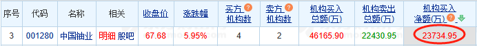 龙虎榜数据显示,买入中国铀业金额最大的前五名中,有3家机构专用席位;卖出中国铀业金额最大的前五名中,有2家机构专用席位。经统计,机构席位今日买入中国铀业净额为23734.95万元。
