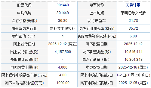 天溯计量2025年12月11日披露的首次公开发行股票并在创业板上市发行公告显示,按本次发行价格36.80元/股计算,公司募集资金总额预计为60,000.00万元,扣除预计发行费用约7,536.86万元(不含增值税)后,预计募集资金净额约为52,463.14万元,如存在尾数差异,为四舍五入造成。
