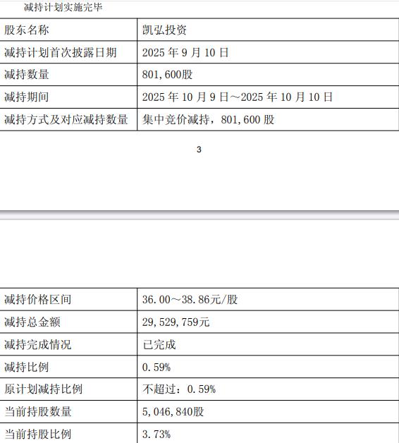 公司于2025年9月10日披露《实际控制人的一致行动人减持股份计划公告》,凯弘投资、毅宁投资系员工持股平台,本次减持主要为解决该平台中员工个人资金需求,拟从2025年10月9日至2026年1月8日期间,通过集中竞价交易和/或大宗交易方式减持所持公司股份,凯弘投资减持数量不超过801,625股(占公司总股本比例0.59%);毅宁投资减持数量不超过123,900股(占公司总股本比例0.09%)。截至公告披露日,凯弘投资、毅宁投资已通过集中竞价交易方式减持公司股份分别为801,600股、123,900股,分别占公司总股本的0.59%、0.09%,上述股东本次减持计划已实施完毕。上述减持金额共计34056887元。