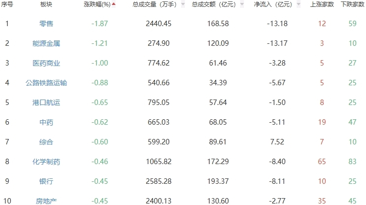 板块方面,电网设备、贵金属、其他电源设备等板块涨幅居前,零售、能源金属、医药商业等板块跌幅居前。