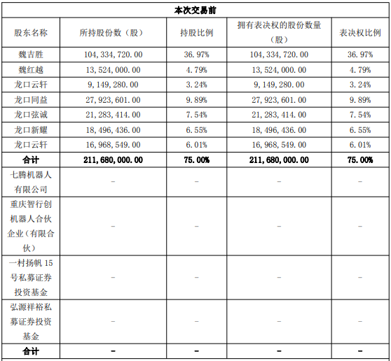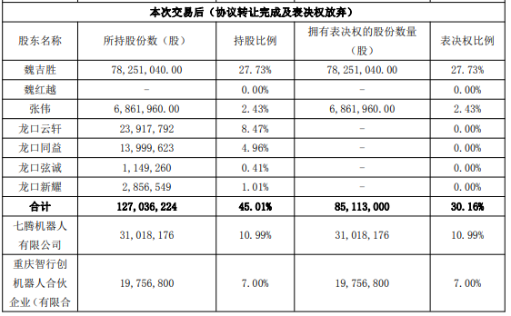 本次交易完成后,七腾机器人将拥有上市公司44.99%的股份及该等股份对应的表决权(持股情况系根据《股份转让协议》中约定的要约收购上限及承诺预受要约上限计算,实际情况以最终要约结果为准),上市公司控股股东变更为“七腾机器人”,实际控制人变更为朱冬。