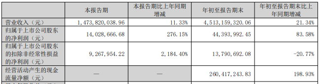 2025年前三季度,公司实现营业收入45.13亿元,同比增长21.34%;归属于上市公司股东的净利润为4,439.40万元,同比增长83.58%;归属于上市公司股东的扣除非经常性损益的净利润为1,379.07万元,同比下降20.77%;经营活动产生的现金流量净额为2.60亿元,同比增长198.93%。