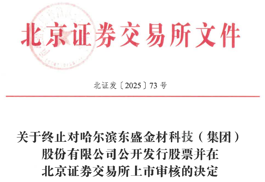 中国经济网北京12月14日讯 据北交所网站12月12日公告显示,北交所决定终止哈尔滨东盛金材科技(集团)股份有限公司(以下简称“东盛金材”)首次公开发行股票并在北京证券交易所上市审核。