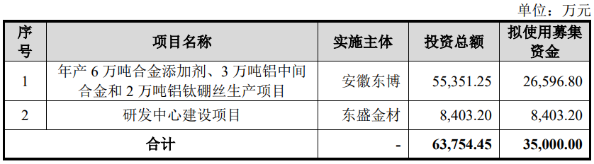 东盛金材原拟募集资金35,000.00万元,用于“年产6万吨合金添加剂、3万吨铝中间合金和2万吨铝钛硼丝生产项目”和“研发中心建设项目”。