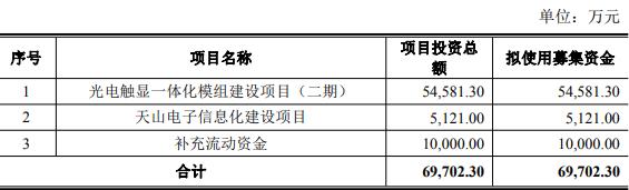 公司本次发行拟募集资金总额不超过69,702.30万元(含本数),扣除发行费用后,募集资金净额拟用于光电触显一体化模组建设项目(二期)、天山电子信息化建设项目、补充流动资金。