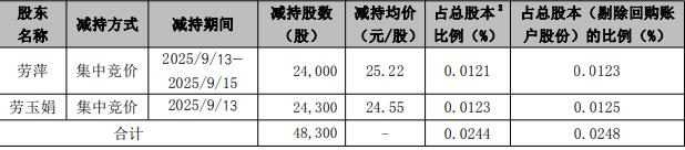 公司9月16日披露关于部分高级管理人员、监事股份减持计划期限届满暨减持结果的公告,公司于近日收到公司监事劳萍、监事劳玉娟、副总裁兼董事会秘书叶小翠和副总裁兼财务负责人陈元涛分别出具的告知函;其中,副总裁兼董事会秘书叶小翠和副总裁兼财务负责人陈元涛在股份减持期间内未减持。劳萍于2025年9月13日至2025年9月15日以集中竞价方式减持24,000股,减持均价25.22元/股,占总股本(剔除回购账户股份)的比例0.0123%;劳玉娟于2025年9月13日以集中竞价方式减持24,300股,减持均价24.55元/股,占总股本(剔除回购账户股份)的比例0.0125%。