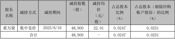 公司6月17日披露的关于部分监事股份减持计划实施完成的公告显示,公司于近日收到黄万梁出具的告知函,获悉黄万梁以集中竞价交易方式累计减持公司股份48,900股,持股比例累计变动0.0247%,减持后黄万梁直接持有公司股份数量为147,100股,持股比例0.0745%。前述减持计划已于2025年6月16日实施完成。