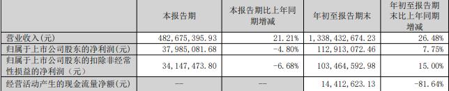 据公司2025年第三季度报告,本报告期,公司实现营业收入4.83亿元,同比增长21.21%;归属于上市公司股东的净利润3798.51万元,同比减少4.80%;扣除非经常性损益后的净利润3414.75万元,同比减少6.68%。