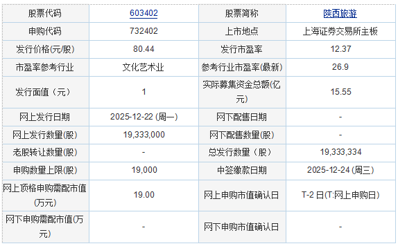 陕西旅游2025年12月19日披露的首次公开发行股票并在主板上市发行公告显示,按本次发行价格80.44元/股和1,933.3334万股的新股发行数量计算,若本次发行成功,预计公司募集资金总额约155,517.34万元,扣除约3,324.65万元(不含增值税)的发行费用后,预计募集资金净额152,192.69万元。