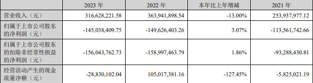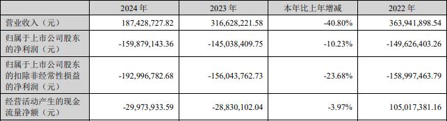 据公司2024年年报,报告期内,公司实现营业收入1.87亿元,同比减少40.80%;归属于上市公司股东的净利润-1.60亿元,2023年为-1.45亿元,2022年为-1.50亿元,2021年为-1.14亿元;归属于上市公司股东的扣非净利润为-1.93亿元,2023年为-1.56亿元,2022年为-1.59亿元,2021年为-9328.84万元;经营活动产生的现金流量净额为-2997.39万元。