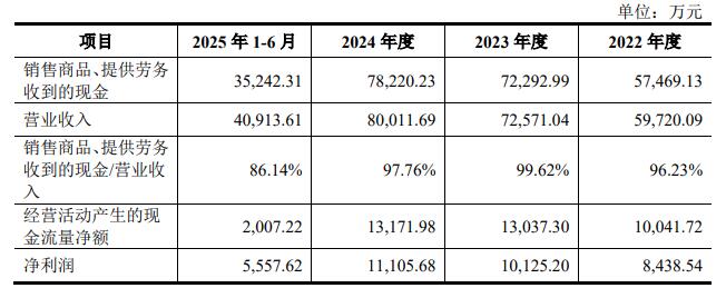 2022年、2023年、2024年、2025年1-6月,天溯计量销售商品、提供劳务收到的现金分别为57,469.13万元、72,292.99万元、78,220.23万元、35,242.31万元,占各期营业总收入比重分别为96.23%、99.62%、97.76%、86.14%;经营活动产生的现金流量净额分别为10,041.72万元、13,037.30万元、13,171.98万元、2,007.22万元,占各期净利润比重分别为119.00%、128.76%、118.61%、36.12%。