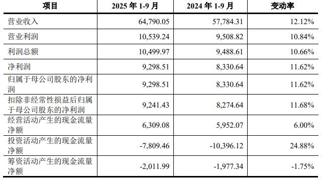 2025年1-9月,天溯计量实现营业收入64,790.05万元,同比增长12.12%;归属于母公司股东的净利润9,298.51万元,同比增长11.62%;扣除非经常性损益后归属于母公司股东的净利润9,241.43万元,同比增长11.68%;经营活动产生的现金流量净额6,309.08万元,同比增长6.00%。