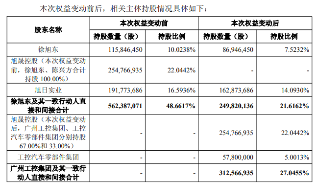 本次权益变动后,广州工控集团、工控汽车零部件集团分别持有旭晟控股67.00%和33.00%股权,旭晟控股持有上市公司254,766,935股股份(占上市公司总股本的22.0442%),工控汽车零部件集团持有上市公司57,800,000股股份(占上市公司总股本的5.0013%)。广州工控集团及其一致行动人将合计持有上市公司312,566,935股股份,占上市公司总股本的比例为27.0455%。同时,广州工控集团根据《控制权收购协议》的约定有权提名超过一半的董事会成员。上市公司原控股股东、实际控制人徐旭东及其一致行动人将合计持有上市公司249,820,136股股份,占上市公司总股本的比例为21.6162%。