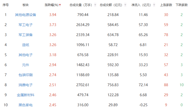 板块方面,其他电源设备、军工电子、军工装备等板块涨幅居前,贵金属、保险、白酒等板块跌幅居前。