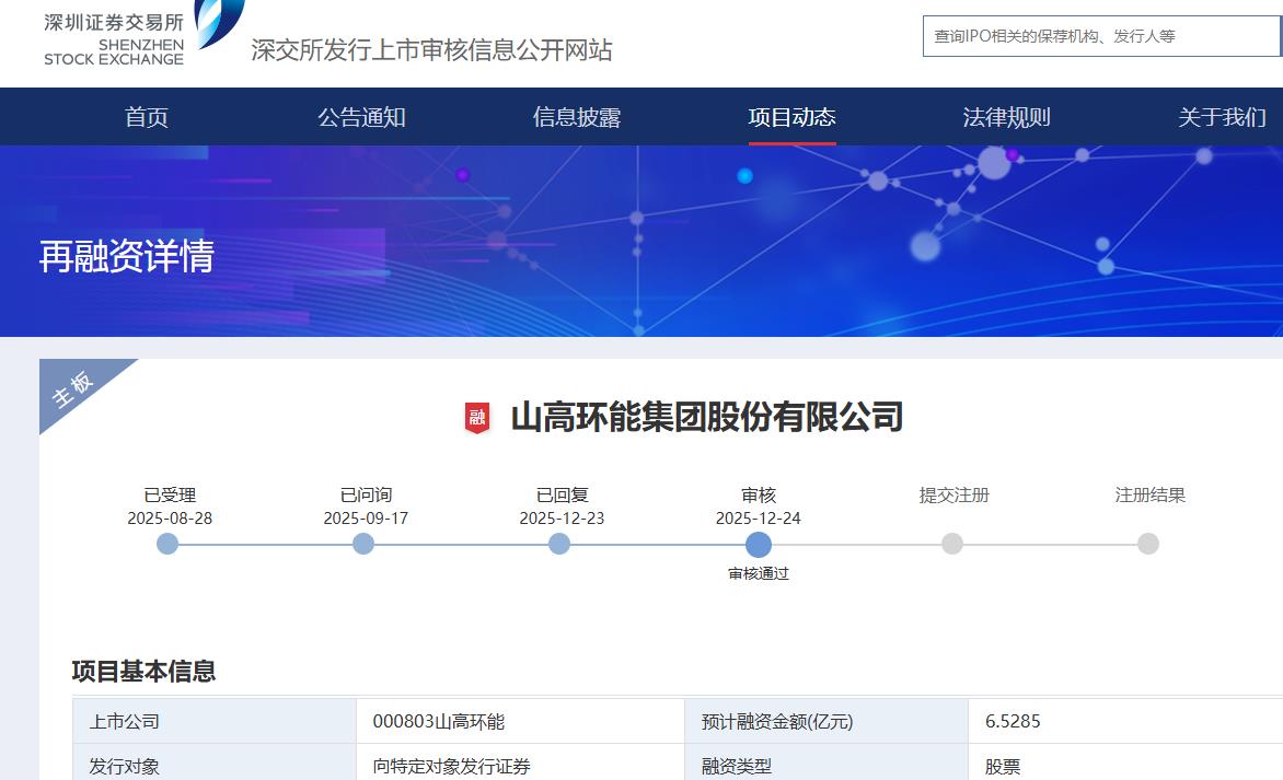 中国经济网北京12月25日讯 山高环能(000803.SZ)向特定对象发行证券事项昨日获得深交所审核通过。