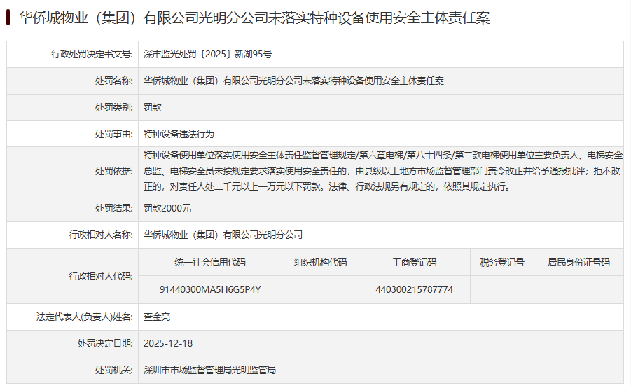 华侨城物业(集团)有限公司光明分公司未落实特种设备使用安全主体责任案显示,华侨城物业(集团)有限公司光明分公司存在特种设备违法行为。根据《特种设备使用单位落实使用安全主体责任监督管理规定》第六章“电梯”第八十四条第二款的规定,深圳市市场监督管理局光明监管局对其处以罚款2000元。