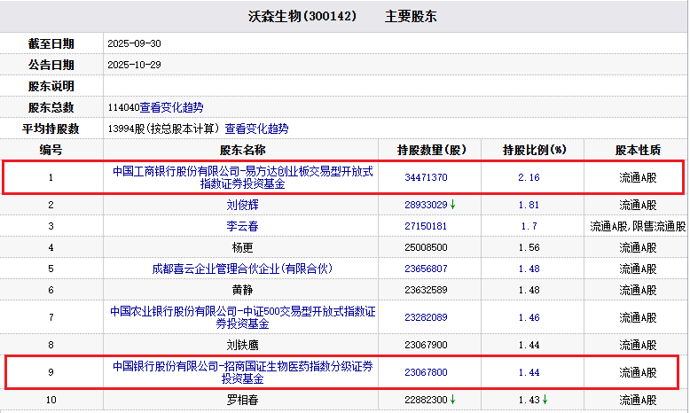 沃森生物主要股东中,截至2025年9月30日,中国工商银行股份有限公司-易方达创业板交易型开放式指数证券投资基金为第一大股东,中国银行股份有限公司-招商国证生物医药指数分级证券投资基金为第九大股东。