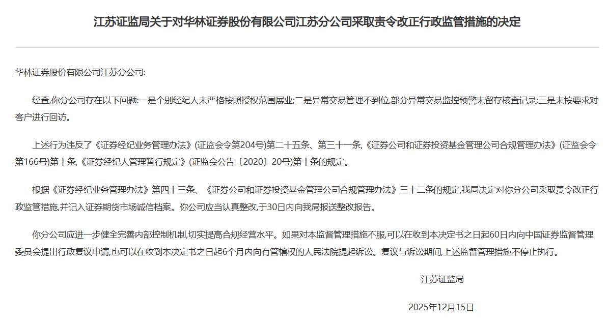 根据《证券经纪业务管理办法》第四十三条、《证券公司和证券投资基金管理公司合规管理办法》三十二条的规定,江苏证监局决定对华林证券江苏分公司采取责令改正行政监管措施,并记入证券期货市场诚信档案。