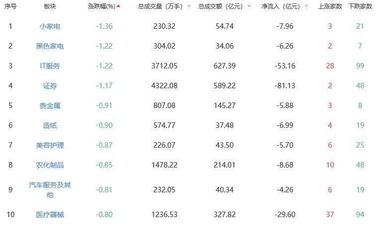 板块方面,电子化学品、煤炭开采加工、金属新材料、半导体等涨幅居前,小家电、黑色家电、IT服务、证券等跌幅居前。