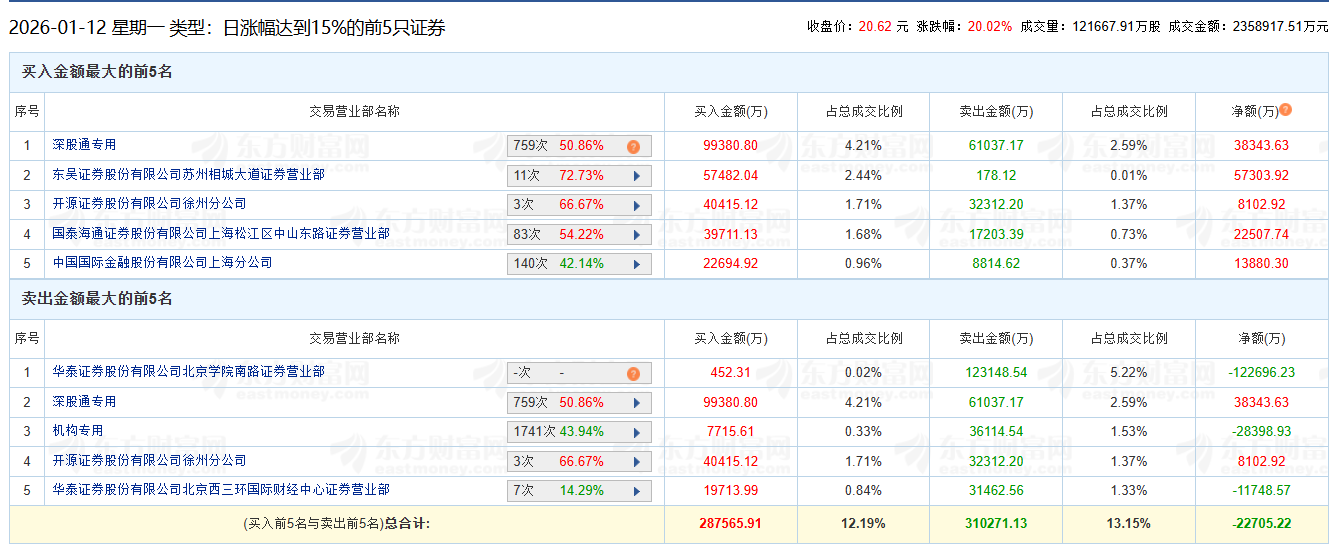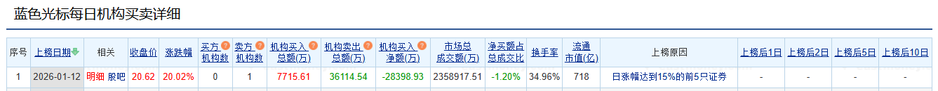 龙虎榜数据显示,作为日涨幅达到15%的前5只证券,卖出蓝色光标金额最大的前五名中,有1家机构专用席位。经统计,机构席位今日卖出蓝色光标净额为28398.93万元。