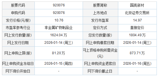 国亮新材2026年1月12日披露的向不特定合格投资者公开发行股票并在北京证券交易所上市发行公告显示,若本次发行成功,预计发行人募集资金总额19,416.26万元,扣除发行费用1,914.06万元(不含增值税)后,预计募集资金净额为17,502.20万元。(如存在尾数差异,为四舍五入造成)。