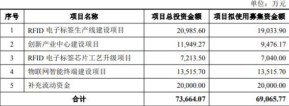 本次发行的募集资金总额不超过69,065.77万元(含本数),扣除发行费用后将全部用于RFID电子标签生产线建设项目、创新产业中心建设项目、RFID电子标签芯片工艺升级项目、物联网智能终端建设项目、补充流动资金。